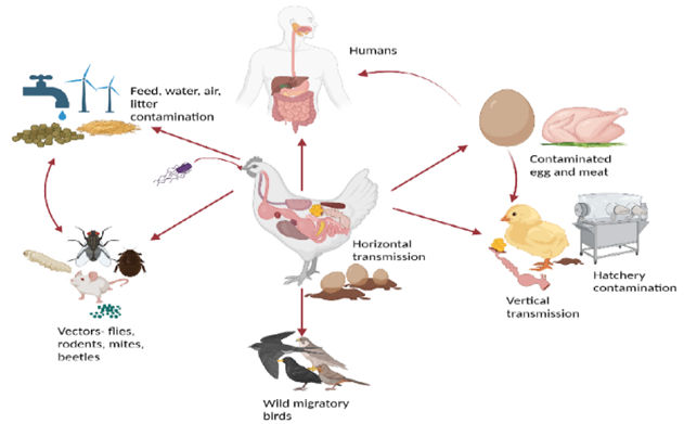 Salmonella primarily spreads through the faeces of infected chicks, contaminated feed, water, and litter. Human activities, such as farm visits without proper biosecurity and movement between chicken houses, also contribute to its spread. Transmission occurs via direct contact with infected birds or indirectly through contaminated environments. Vertical transmission, particularly through infected eggs, is key in sustaining outbreaks, as asymptomatic carriers can pass the bacteria to offspring for up to 14 weeks. These bacteria can survive in the environment for months under favourable conditions, though sunlight and high temperatures reduce their persistence. Wild birds, mammals, and insects, especially red mites, can act as vectors, complicating control efforts.