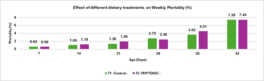 Conclusion:The mortality rate in the T2 – PHYTOGIC group fed at 150g/ton of feed was (7.44%) slightly higher than the T1 – Control group (7.39%), with a 0.27% difference. This minimal variation indicates that PHYTOGIC supplementation had no significant effect on broiler mortality under the conditions of this study.