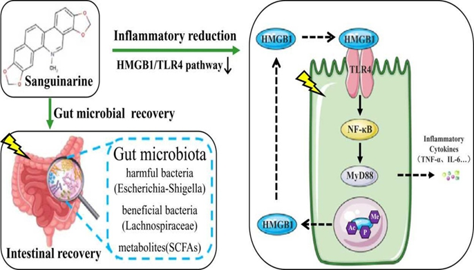 By inhibiting the HMGB1-TLR4-NF-κB axis at multiple stages, sanguinarine effectively suppresses the inflammatory response.