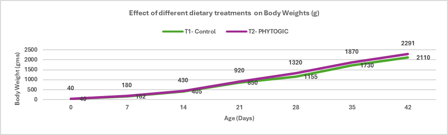 Effect of Supplementation of Phytogic on body growth performance parameters like Body Weights, Feed Consumption, FCR and Average Daily gain of Control and Treatment Groups