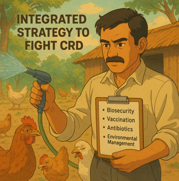 An integrated CRD control strategy combines biosecurity, vaccination, early detection, nutritional support, and precision medication.
