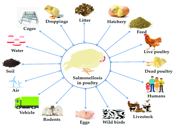 Various modes of transmission in poultry are- through vertical transmission from infected breeders to eggs, horizontal transmission via contaminated feed, water, litter, equipment and vectors and last but not least cross-contamination during processing, making it a persistent farm-to-fork threat.