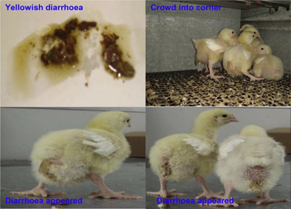 Fig. 3: Vent paste, diarrhoea and huddling in chicks.