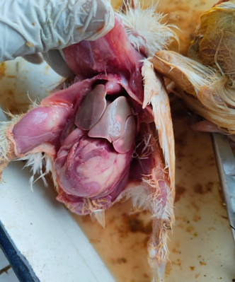 Fig 2. Necrotic foci on liver, in chicken